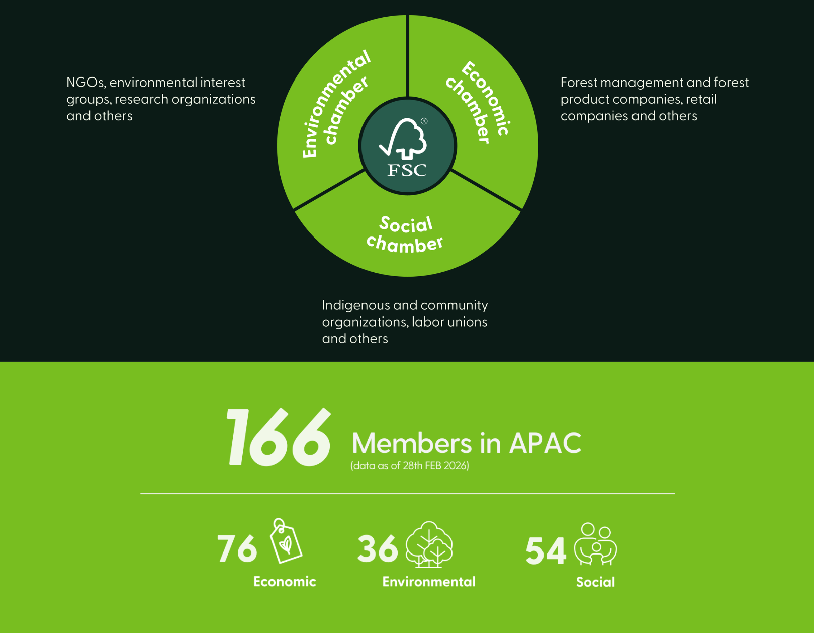 FSC international members come from all across the globe and represent the global South and global North, with interests spread across three chambers: Social, Environmental and Economic.