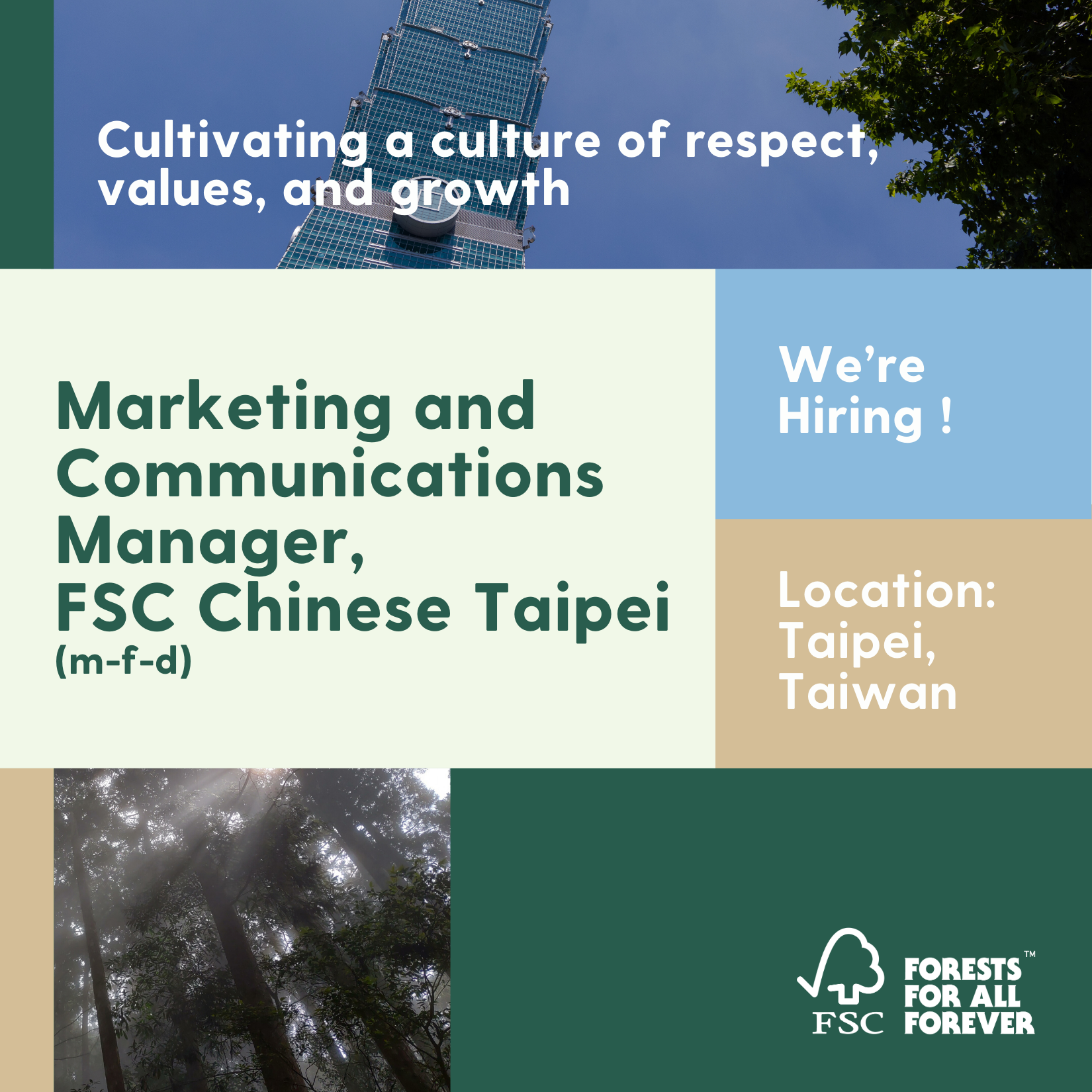 ๐ช๐ฒ'๐ฟ๐ฒ ๐ต๐ถ๐ฟ๐ถ๐ป๐ด a ๐ ๐ฎ๐ฟ๐ธ๐ฒ๐๐ถ๐ป๐ด & ๐๐ผ๐บ๐บ๐๐ป๐ถ๐ฐ๐ฎ๐๐ถ๐ผ๐ป๐ ๐ ๐ฎ๐ป๐ฎ๐ด๐ฒ๐ฟ for FSC Chinese Taipei, someone whoโs excited to grow our market presence in๐Taiwan and help more businesses and communities choose responsible forestry.